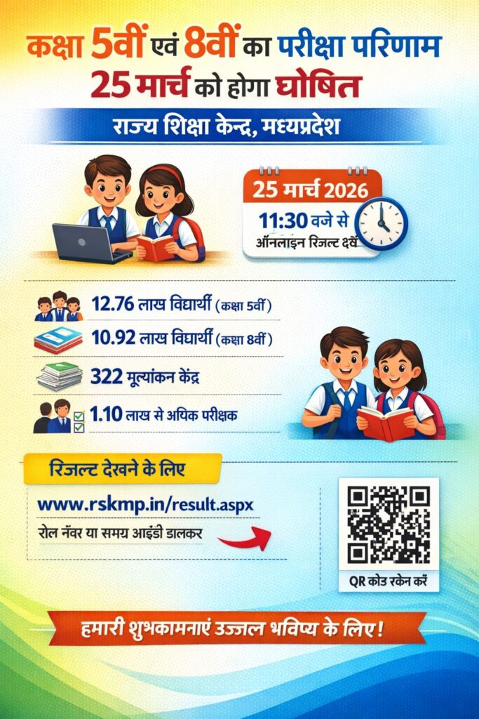 भोपाल, 24 मार्च 2026 — राज्य शिक्षा केन्द्र मध्यप्रदेश द्वारा कक्षा 5वीं एवं 8वीं के वार्षिक परीक्षा परिणाम 25 मार्च (बुधवार) को घोषित किए जाएंगे। विद्यार्थी सुबह 11:30 बजे से अपना परिणाम ऑनलाइन देख सकेंगे।प्राप्त जानकारी के अनुसार, परिणाम घोषित करने की प्रक्रिया सुबह 11 बजे राज्य शिक्षा केन्द्र कार्यालय में प्रारंभ होगी, जिसके बाद 11:30 बजे परिणाम आधिकारिक पोर्टल पर उपलब्ध करा दिए जाएंगे।इस वर्ष कक्षा 5वीं और 8वीं की परीक्षाएं बोर्ड पैटर्न पर आयोजित की गई थीं, जो 20 फरवरी से 28 फरवरी 2026 के बीच संपन्न हुईं। इन परीक्षाओं में प्रदेश के शासकीय, अशासकीय विद्यालयों एवं पंजीकृत मदरसों के बड़ी संख्या में विद्यार्थियों ने भाग लिया।कक्षा 5वीं में 12 लाख 76 हजार से अधिक तथा कक्षा 8वीं में 10 लाख 92 हजार से अधिक विद्यार्थी शामिल हुए। इस प्रकार कुल मिलाकर लगभग 23 लाख 68 हजार से अधिक विद्यार्थियों ने परीक्षा दी।उत्तर पुस्तिकाओं के मूल्यांकन के लिए प्रदेशभर में 322 मूल्यांकन केंद्र बनाए गए थे, जहां 1 लाख 10 हजार से अधिक मूल्यांकनकर्ताओं द्वारा कॉपियों का मूल्यांकन किया गया। मूल्यांकन के बाद प्राप्त अंकों की ऑनलाइन प्रविष्टि पोर्टल पर दर्ज की गई, जिससे परिणाम प्रक्रिया को पारदर्शी और त्वरित बनाया जा सका।विद्यार्थी अपना परीक्षा परिणाम आधिकारिक वेबसाइट पर जाकर रोल नंबर या समग्र आईडी के माध्यम से देख सकेंगे। इसके साथ ही अभिभावक एवं शिक्षक भी इसी पोर्टल के माध्यम से परिणाम की जानकारी प्राप्त कर सकेंगे।स्कूलों के प्राचार्य अपने संस्थान का विद्यार्थीवार परिणाम भी ऑनलाइन एक्सेस कर सकेंगे। सुविधा को और सरल बनाने के लिए क्यूआर कोड के माध्यम से भी परिणाम पोर्टल का लिंक उपलब्ध कराया गया है।राज्य शिक्षा केन्द्र ने सभी विद्यार्थियों को शुभकामनाएं देते हुए उनके उज्ज्वल भविष्य की कामना की है।