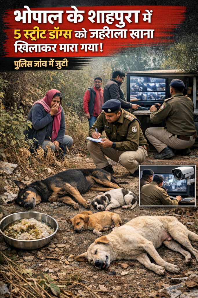 शाहपुरा थाना प्रभारी श्री लोकेन्द्र सिंह ठाकुर ने बताया कि 25 जनवरी के बाद कॉलोनी में रहने वाले स्ट्रीट डॉग्स अचानक दिखाई नहीं दिए। इस पर कुछ जागरूक रहवासियों ने उनकी तलाश शुरू की। तलाश के दौरान पास के एक सुनसान मैदान में झाड़ियों के पीछे पहले दो कुत्ते मृत अवस्था में मिले। आगे खोजबीन करने पर कुछ दूरी पर दो अन्य कुत्ते और एक पिल्ला भी पड़े मिले। सभी कुत्ते बेहोशी की हालत में थे।स्थानीय लोगों और पशु प्रेमियों की मदद से सभी कुत्तों को तत्काल पशु चिकित्सालय पहुंचाया गया। जांच के बाद पशु चिकित्सकों ने पुष्टि की कि कुत्तों को किसी जहरीले पदार्थ का सेवन कराया गया था। इसके बाद पूरे मामले की शिकायत पुलिस थाने में दर्ज कराई गई।
