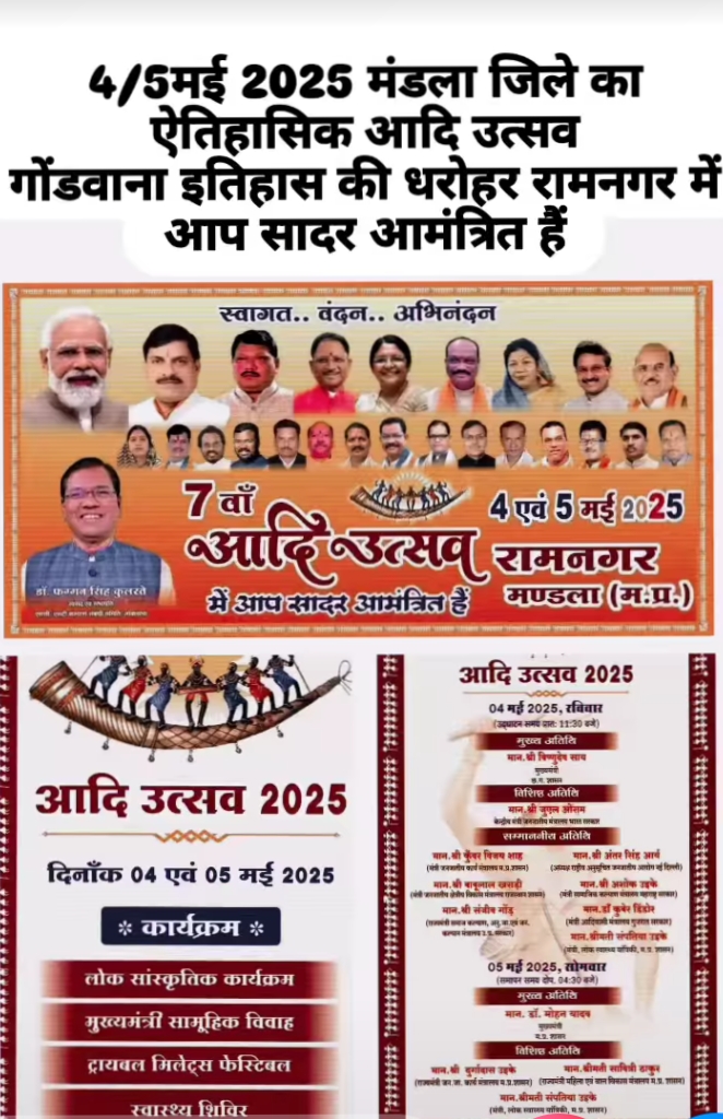 मंडला जिले की पावन धरती पर आयोजित “एतिहासिक आदि उत्सव” में, जो गोंडवाना की गौरवशाली संस्कृति, परंपराओं और इतिहास को समर्पित है। यह उत्सव न केवल जनजातीय लोककला, संगीत और नृत्य का उत्सव है, बल्कि यह हमारी आदिवासी विरासत का जीवंत प्रतीक है।