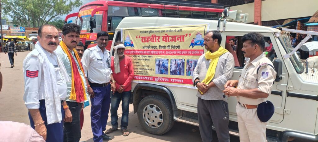 सड़क परिवहन एवं राजमार्ग मंत्रालय द्वारा जारी गाईडलाइन एवं पुलिस मुख्यालय पीटीआरआई भोपाल द्वारा प्रदत्त निर्देशों के पालन में जिले में हो रही सड़क दुर्घटनाओं में कमी लाने के लिए पुलिस अधीक्षक पन्ना श्री साई कृष्णा एस थोटा, अतिरिक्त पुलिस अधीक्षक पन्ना श्रीमती वंदना सिंह चौहान व अनुविभागीय अधिकारी एस.पी.सिंह बघेल के निर्देशन में थाना प्रभारी यातायात निरीक्षक श्रीमती नीलम लक्षकार द्वारा राहवीर योजना ( Erstwhile Good Samaritan Scheme ) के प्रभावी क्रियान्वयन हेतु व्यापक प्रचार-प्रसार किया जा रहा है, इसी तारतम्य में थाना प्रभारी यातायात निरीक्षक श्रीमती नीलम लक्षकार ने बस स्टेण्ड पन्ना में उपस्थित आमजनों को राहगीर योजना ( Rah-Veer ) सहित यातायात नियमों सें संबंधित बिस्तृत जानकारी दी । उन्होंने बताया कि राहवीर योजना के तहत वाहन दुर्घटना में गंभीर रूप से घायल व्यक्तियों को गोल्डन आवर में नजदीकी अस्पताल, ट्रामा सेंटर पहुंचाकर मदद करने वाले व्यक्तियों को सड़क परिवहन एवं राज मार्ग मंत्रालय द्वारा 25 हजार रुपए नगद राशि एवं प्रशस्ति-पत्र दिए जाने के प्रावधान है एवं ऐसे राहवीर जो सड़क दुर्घटना में गंभीर घायल व्यक्ति को त्वरित मदद पहुंचायेंगे उनमें से 10 लोगों को राष्ट्रीय स्तर पर पुरस्कार प्रदाय किये जायेंगे