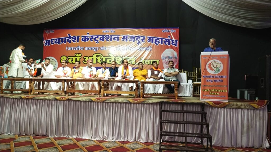 मध्य प्रदेश कंस्ट्रूशन मज़दूर महासंघ भारतीय मजदुर संघ की औधोगिक इकाई का 8 वा अधिवेशन उज्जैन रोड़ स्थित होटल डमरू देवास में अयोजित किया गया। प्रारंभ में प्रदेश उपाध्यक्ष अशोक चौहान सुभाष वर्मा धनंजय गायकवाड सचिन सेन माखनलाल धाकड़ नवीन वर्मा शाजापुर आदि पदाधिकारीयो ने हेलीपैड पर माननीय श्रम मंत्री पहलाद पटेल की अगवानी कर उन्हें पुष्प कुछ भेंट किया पश्चात उन्हें लेकर कार्यक्रम में पहुंचे कार्यक्रम के मुख्य अतिथि मध्य प्रदेश शासन के श्रम मंत्री श्री प्रहलाद सिंह जी पटेल विशेष अतिथि देवास क्षेत्र की लोक प्रिय विधायक श्री मति गायत्री राजे पंवार, श्री सुल्तान जी शेखावत रहे। माननिय मंत्री द्वारा संबोधित करते हुए कहा कि मजदूर को उसका हक सही समय पर मिल जाए उसके लिए हमे प्रयासरत होना चाहिए।और सदैव मजदूर के हक़ में खड़ा होना चाहिए। द्वितीय सत्र में त्रिय वार्षिक चुनाव संपन्न हुए इसमें अशोक चौहान पुनः प्रदेश उपाध्यक्ष एवं सचिन सेन पलसूद प्रदेश मंत्री के पद पर निर्वाचित किए गए इस अवसर पर लोकेश जी विजयवर्गीय प्रदेश महामंत्री मध्य प्रदेश कंस्ट्रक्शन मजदूर संघ , अशोक जी चौहान प्रदेश उपाध्यक्ष सुभाष जी वर्मा प्रदेश सचिव सुभाष वर्मा ने संबोधित करते हुए मांग की गई की कंस्ट्रक्शन मजदूरों की घटना दुर्घटना में मृत्यु होने पर उन्हें 10 लाख का मुआवजा दिया जाए शासन प्रशासन के सामने पुरजोर तरीके से संगठन की बातें रखी जाए अगर शासन हमारी बात को नहीं माने तो गांधीवादी तरीके से आंदोलन किया जाए, सचिन जी सेन बड़वानी जिला अध्यक्ष और नवीन वर्मा जिला अध्यक्ष शाजापुर मोजूद रहे। इस अवसर पर सभी प्रतिनिधियों को हैंडबैग व स्मृति चिन्ह प्रदान किए गए