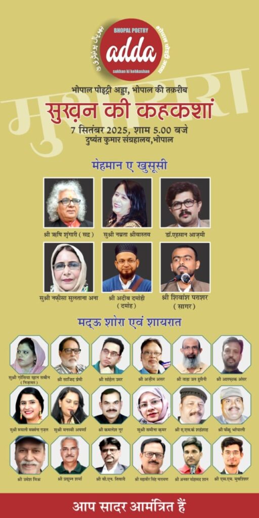 इस कार्यक्रम की अध्यक्षता वरिष्ठ गीतकार श्री ऋषि शृंगारी की अध्यक्षता में भोपाल पोइट्री अड्डा का दूसरा आयोजन सुख़न की कहकशां 7 सितम्बर 2025 रविवार शाम 5.00 बजे दुष्यंत कुमार संग्राहलय भोपाल में आयोजित हुआ। सुश्री नम्रता श्रीवास्तव, डॉ. एहसान आज़मी, सुश्री नफ़ीसा सुलताना ”अना“, श्री अदीब दमोही (दमोह), श्री शिवांश पराशर ‘राही; (सागर) ने मुख्यअतिथि के रूप में कार्यक्रम में उपस्थित रहे। कार्यक्रम का संचालन सुश्री ग़ोसिया ख़ान सबीन ने किया। इस आयोजन में वरिष्ठ एवं युवा रचनाकारों को आमंत्रित किया गया था जिसमें सुश्री ग़ोसिया ख़ान सबीन, श्री साजिद प्रेमी, श्री सोहेल उमर, श्री अज़ीम असर, श्री ताहा उल हुसैनी, श्री अशफ़ाक़ अंसर, सुश्री रूपाली सक्सेना ‘ग़ज़ल’, सुश्री मनस्वी अपर्णा, श्री कमलेश ‘नूर’, सुश्री समीना क़मर, श्री सईद खान शहंशाह, श्री फेकू भोपाली, श्री उमेश मिश्र, श्री प्रद्युम्न शर्मा, श्री बी.एन. तिवारी, श्री महावीर सिंह नारायण, श्री अनवर मोहम्मद शान, श्री एस.एम. मुबश्शिर किया गया था। रचनाकारों ने अपनी चयनित रचनाएं प्रस्तुत कीं जिसमें :- हद किसी की नापना मैंने नहीं सीखा/फिर भला कैसे किसी तूफ़ाँ से डर जाऊँ-ऋषि श्रृंगारी, ये अदब की महफिलें ये रतजगे/तुमसे मिलने का कहाना हो गया/ छोड़ नम्रता फिर कोई ताज़ा ग़ज़ल/आज मौसम शायराना हो गया-नम्रता श्रीवास्तव, ”मैं“ की दीवार जो इक बार गिरा सकता है/राह की कोई भी दीवार गिरा सकता है- डॉ. एहसान आज़मी, इतनी तो ”अना“ आपकी फितरत में है लाज़िम/खुद्दार को फिरते हुऐ दर-बदर नहीं देखा- नफीसा सुलताना ‘अना’, ज़ख़्म खाकर भी परिंदा न रूका उड़ता रहा/हाथ मलता ही रहा तीर चलाने वाला-अदीब दमोही, इश्क़ के दर्या में लाए जिस्म की ही मछलियाँ/मैं समझता था के इसमें कुछ नया ढूँडेंगे लोग-शिवांश पराशर ”राही“, यह ज़र्फ़े सुख़न है के ग़ज़ल कहती रही हूँ/दुश्मन मेरा जलता है जले मेरी बला से-ग़ोसिया ख़ान सबीन, अगर आओ तो है सोना सनीचर/न आओ तुम तो हो इतवार मिट्टी-साजिद प्रेमी, सजदा भी सिर्फ एक आदत है/अब इबादत कहाँ इबादत है-सोहेल उमर साहिल, गुलशन में रोज रोज़ ही तुम ढूंडते हो क्या/कोई भी फूल तुमसा नहीं है यक़ी करो-अज़ीम असर, देख कर मजबूर माँ को दिल पे इक झटका लगा/दस बरस की उम्र ही में काम पर बच्चा लगा-ताहा उल हुसैनी, हमें बहुत तलाश किया मिल नहीं सका/ऐसा कोई के आपके जैसा कहें जिसे-अशफ़ाक़ अंसर, सो रहा है जाने क्या क्या अपनी लालच/लालची हर शख़्स फिर भी ग़फ़लतों में क़ैद है-रूपाली सकसेना ‘ग़ज़ल’, आई हूँ उससे कहने कोई बात बैठकर/कहना है हाँ कहूँगी मगर पास बैठकर-मनस्वी अपर्णा, फैलाव गगन का, मेरे आँगन की तरह है/हिम्मत का मेरी आपने, राह पर नहीं देखा-कमलेश नूर, लम्हा-लम्हा क़यामत का लम्हा है अब/एक पल इक सदी है 