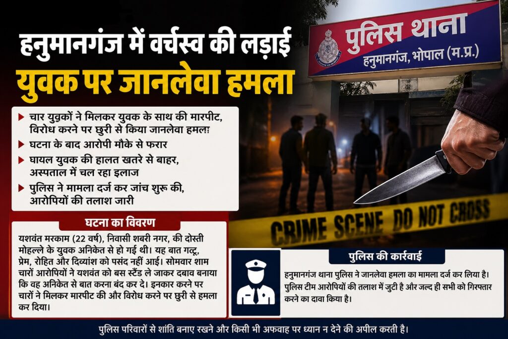 राजधानी Bhopal के हनुमानगंज क्षेत्र में मोहल्ले की आपसी रंजिश ने हिंसक रूप ले लिया, जिसमें एक युवक पर छुरी से जानलेवा हमला किए जाने का मामला सामने आया है। घटना के बाद पुलिस ने मामला दर्ज कर जांच प्रारंभ कर दी है।हनुमानगंज थाना पुलिस से प्राप्त जानकारी के अनुसार, 22 वर्षीय यशवंत मरकाम, निवासी शबरी नगर, अपने ही क्षेत्र के चार युवकों—गट्टू, प्रेम, रोहित और दिव्यांश—को पहले से जानता था। हाल के दिनों में यशवंत की मोहल्ले के एक अन्य युवक अनिकेत से मित्रता हो गई थी, जो कथित रूप से आरोपियों के विरोधी समूह से जुड़ा हुआ है।बताया गया है कि सोमवार शाम आरोपियों ने यशवंत को बहाने से बस स्टैंड की ओर बुलाया, जहां उस पर अनिकेत से संबंध समाप्त करने का दबाव बनाया गया। यशवंत द्वारा गुटबाजी में शामिल होने से इनकार करने पर चारों युवक आक्रोशित हो गए और उसके साथ मारपीट शुरू कर दी। विरोध करने पर आरोपियों ने उस पर छुरी से हमला कर दिया और मौके से फरार हो गए।घटना के बाद स्थानीय लोगों की सहायता से घायल युवक को तत्काल अस्पताल पहुंचाया गया, जहां उसका उपचार जारी है। चिकित्सकों के अनुसार उसकी स्थिति अब खतरे से बाहर बताई जा रही है।पुलिस ने मामले में जानलेवा हमला (Attempt to Murder) का प्रकरण दर्ज कर लिया है और आरोपियों की तलाश के लिए टीम गठित कर दी गई है। पुलिस का कहना है कि शीघ्र ही सभी आरोपियों को गिरफ्तार कर लिया जाएगा।प्रशासन ने नागरिकों से शांति बनाए रखने और किसी भी प्रकार की अफवाहों से बचने की अपील की है।